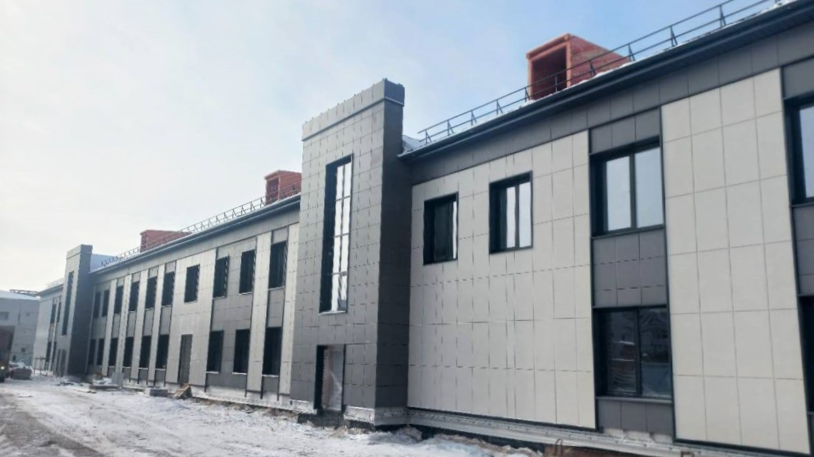 Процент оперативной готовности объекта составляет 39%. Сейчас специалисты проводят фасадные и кровельные работы, монтаж инженерных сетей (водоснабжение, канализация, слаботочные сети, отопление).