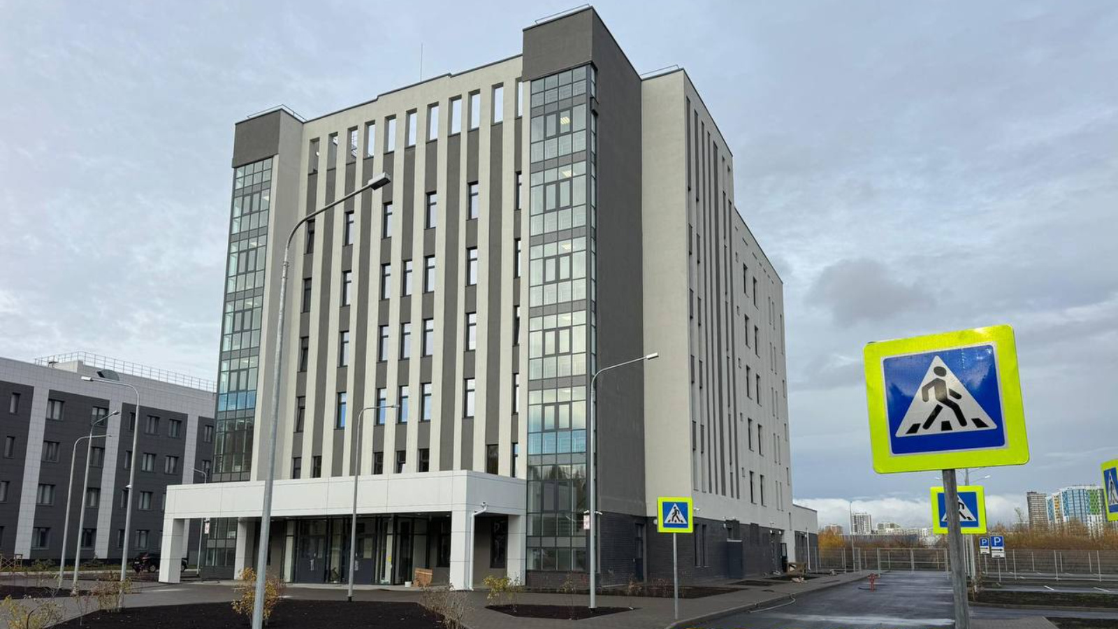 На сегодняшний день на объекте ведутся пусконаладочные работы, клининг. Территория здания благоустроена, обустроена парковка для автомобилей.