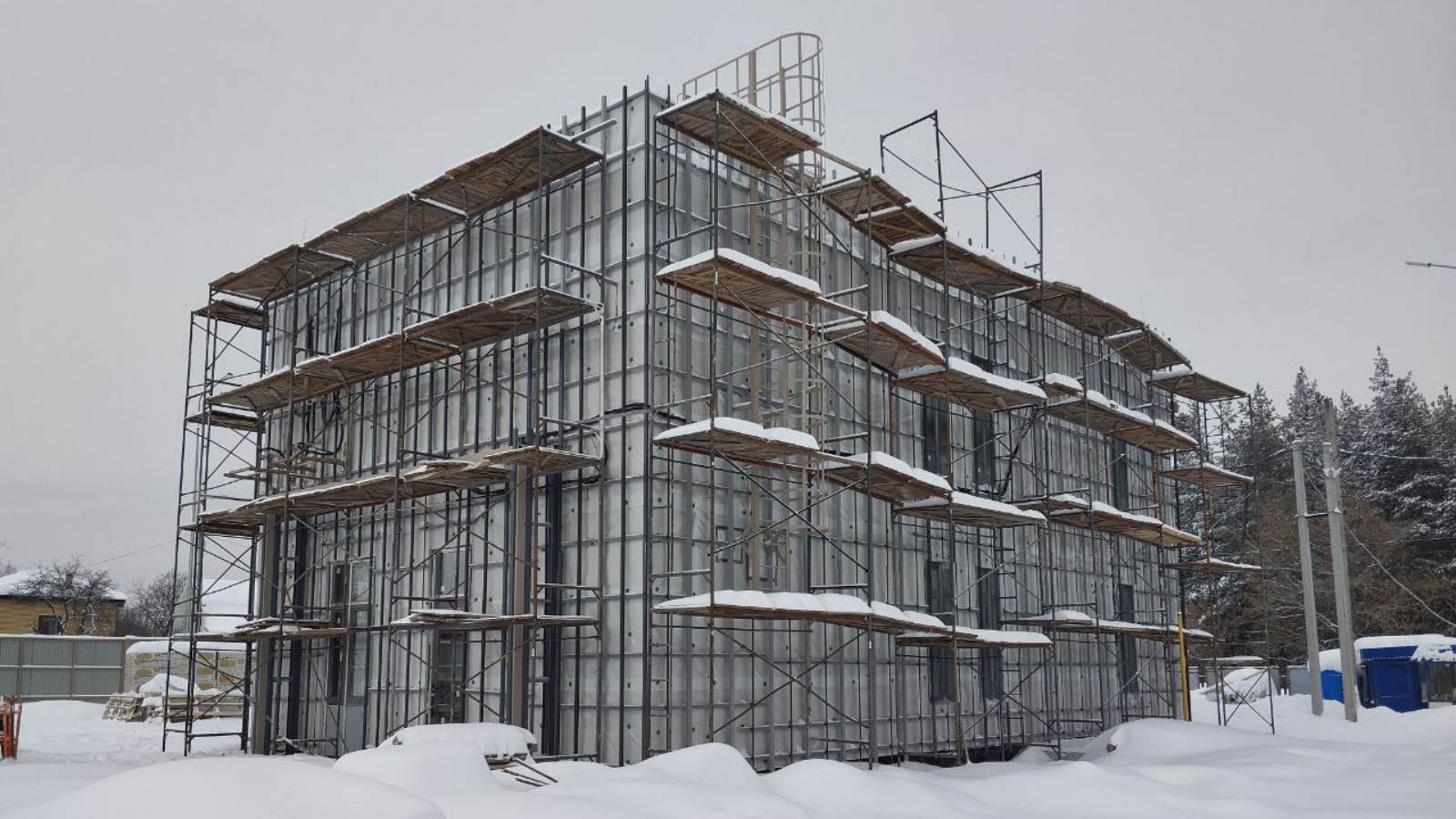 На сегодняшний день на объекте завершена кирпичная кладка, установка окон, утепление фасада здания, ведется устройство кровли, прокладка внутренних сетей электроснабжения, слаботочных сетей, устройство системы газоснабжения. Строительно-монтажные работы выполнены на 50%.